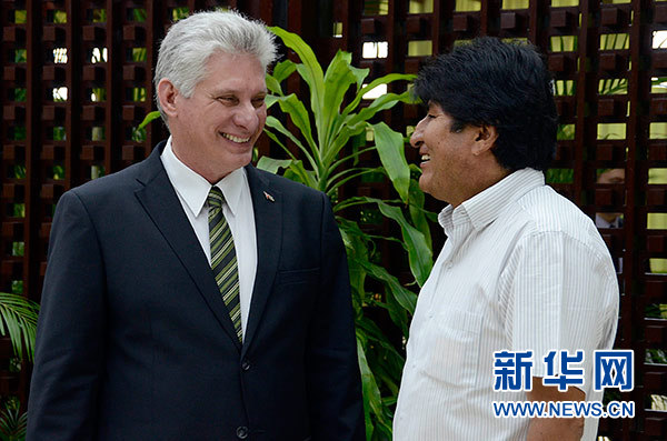 12月14日,在古巴哈瓦那,古巴國(guó)務(wù)委員會(huì)主席兼部長(zhǎng)會(huì)議主席迪亞斯-卡內(nèi)爾(左)在峰會(huì)開幕前和玻利維亞總統(tǒng)莫拉萊斯交談。 新華社發(fā)(華金·埃爾南德斯 攝)