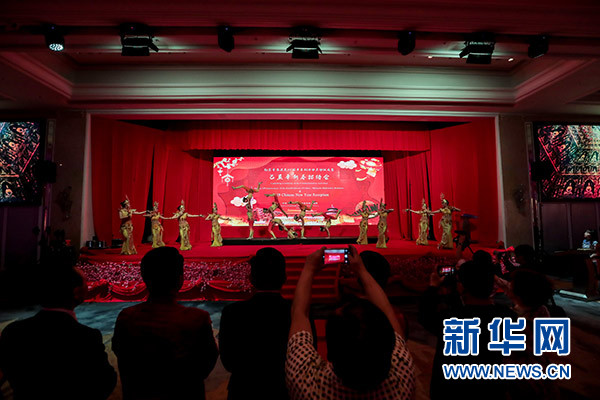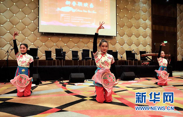 1月30日,在科威特的費(fèi)爾瓦尼耶省,來(lái)自南京藝術(shù)團(tuán)的演員在中國(guó)駐科威特使館新春招待會(huì)上表演民族舞蹈。新華社發(fā)(約瑟夫 攝)