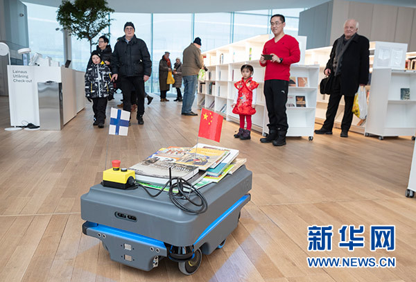 2月4日,機(jī)器人載著捐贈(zèng)的英文圖書(shū)在芬蘭赫爾辛基奧迪圖書(shū)館內(nèi)巡游展示,引得許多讀者駐足觀看。新華社發(fā)(馬蒂·馬蒂凱寧 攝)