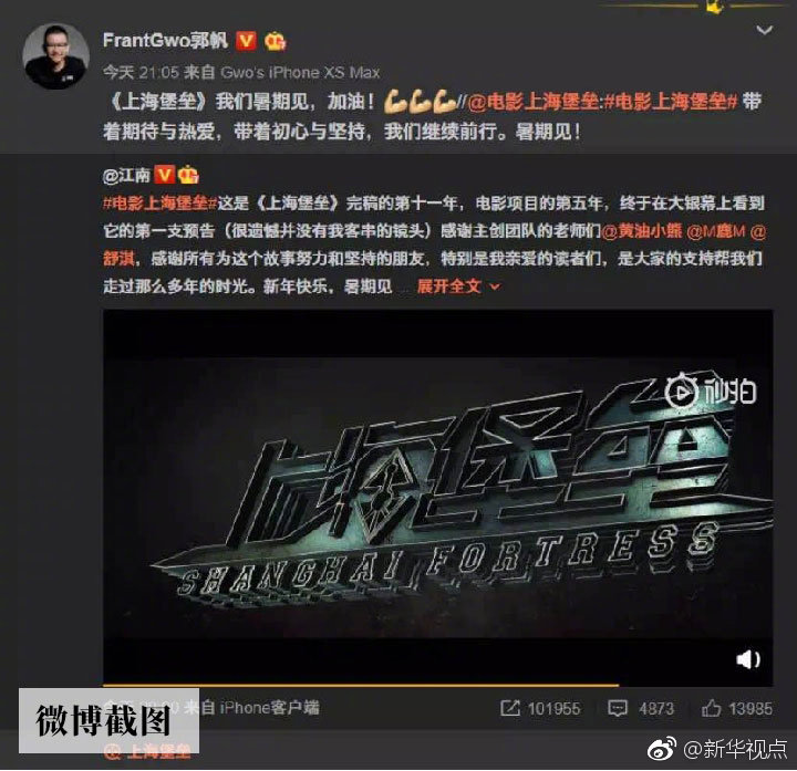 郭帆日前就在微博上轉(zhuǎn)發(fā)了科幻電影《上海堡壘》首個宣傳片,并表達對影片的期待。此片也是由《流浪地球》聯(lián)合出品方之一的騰訊影業(yè)參與出品,預計將于今年暑期上映。這種“抱團取暖”的作法也讓不少科幻迷在網(wǎng)上津津樂道。