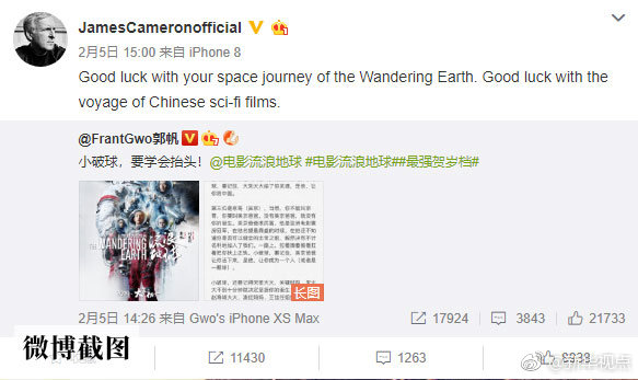 正如好萊塢大導演詹姆斯·卡梅隆在社交媒體上對《流浪地球》發(fā)出的祝愿:“祝中國科幻電影之旅好運!”