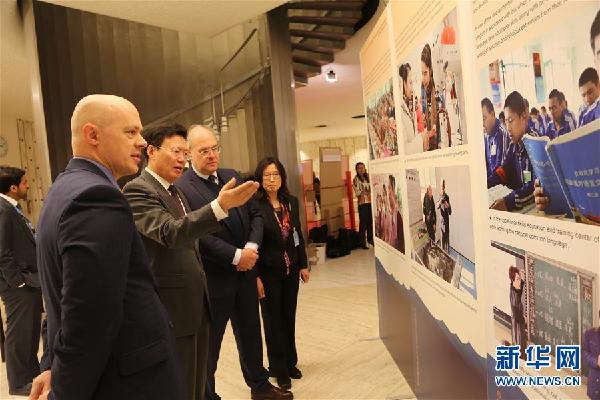 3月4日,在瑞士日內瓦聯(lián)合國萬國宮,來賓參觀“中國新疆人權事業(yè)發(fā)展進步”圖片展。新華社記者 施建國 攝