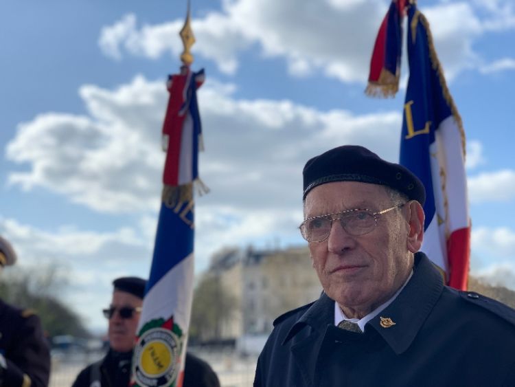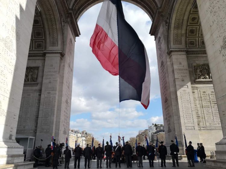 法國(guó)老戰(zhàn)士在凱旋門(mén)前。新華社記者 高潔 攝