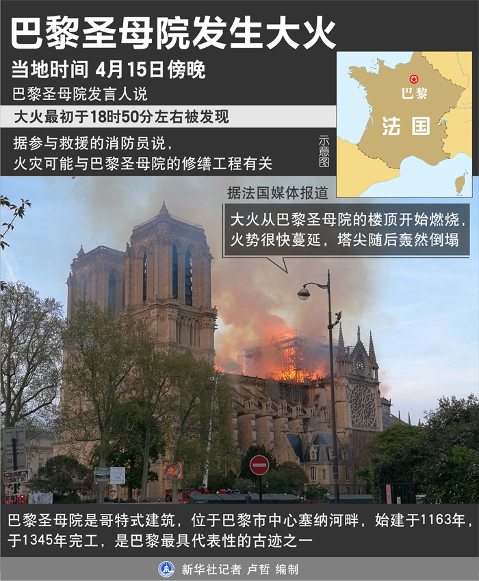 新華社巴黎4月15日電(記者唐霽 徐永春)位于法國首都的巴黎圣母院15日傍晚發(fā)生大火,造成巴黎圣母院塔尖倒塌,建筑損毀嚴重。目前尚無人員傷亡的報告。