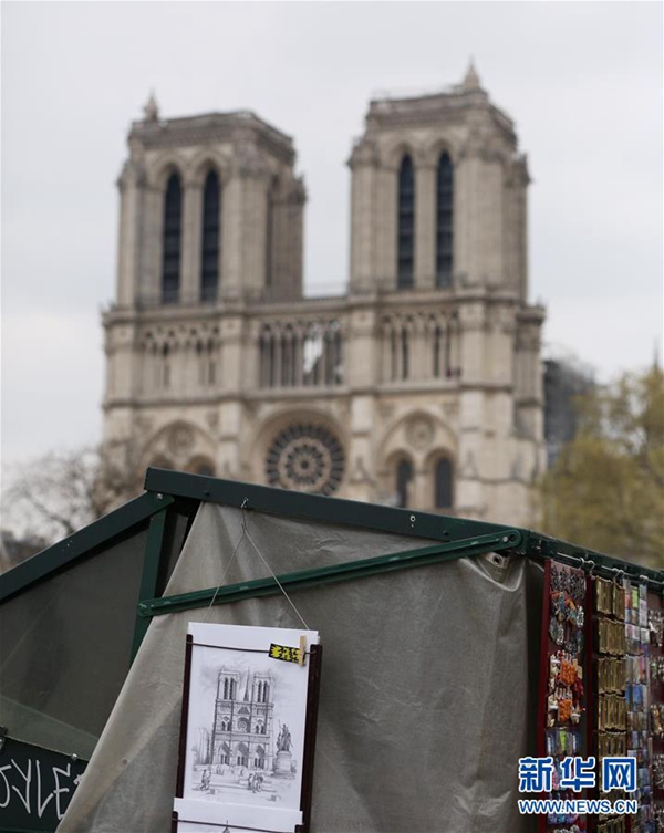 這是4月16日在法國(guó)巴黎拍攝的火災(zāi)后的巴黎圣母院以及書攤上售賣的圣母院圖片。法國(guó)總統(tǒng)馬克龍16日晚針對(duì)巴黎圣母院嚴(yán)重火災(zāi)發(fā)表簡(jiǎn)短電視講話,表示希望在五年內(nèi)重建巴黎圣母院。新華社記者 高靜 攝