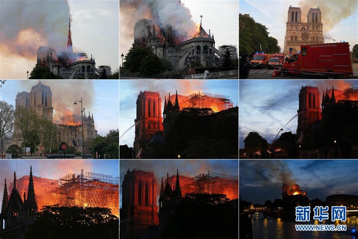 這張拼版照片顯示的是4月15日,在法國巴黎,巴黎圣母院燃起大火。當(dāng)?shù)貢r(shí)間15日傍晚,位于巴黎市中心、有著800多年歷史的巴黎圣母院發(fā)生大火,熊熊烈火之中,巴黎圣母院塔尖轟然倒塌,整座建筑損毀嚴(yán)重。新華社發(fā)