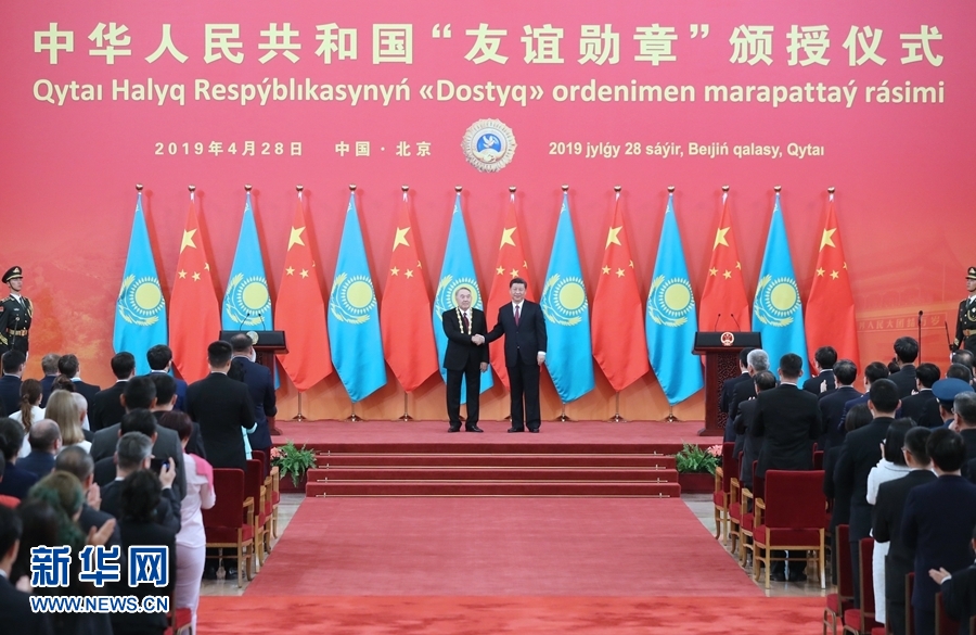 納扎爾巴耶夫致答辭。納扎爾巴耶夫表示,非常感謝習近平主席今天向我頒授中華人民共和國“友誼勛章”,這對我是無上榮譽。這枚勛章反映了中方對我致力于推進哈中全面戰(zhàn)略伙伴關系努力的高度認可。哈中在相互尊重和相互信任基礎上建立起的友好關系已經成為國與國關系的典范,兩國間沒有任何未決問題。我同中國領導人之間的深厚友誼和互信將永遠留在我心里。我衷心祝賀中國成功舉辦第二屆“一帶一路”國際合作高峰論壇。習近平主席提出的“一帶一路”倡議,已經成為成功的國際合作平臺,不僅推動了亞歐大陸的共同發(fā)展,也促進了世界的和平與繁榮。在中華人民共和國成立70周年之際,我衷心祝愿中國人民在以習近平同志為核心的中國共產黨領導下,順利實現(xiàn)中華民族偉大復興的中國夢。中國的發(fā)展繁榮對世界是重大利好。