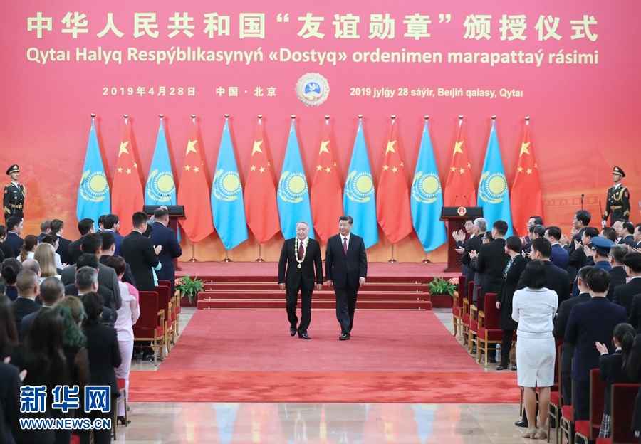 4月28日,國家主席習近平在北京人民大會堂中央大廳為哈薩克斯坦首任總統(tǒng)納扎爾巴耶夫舉行“友誼勛章”頒授儀式。新華社記者 鞠鵬 攝
