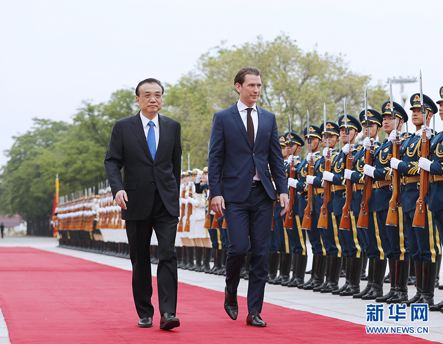 4月28日,國務(wù)院總理李克強(qiáng)在北京人民大會(huì)堂同奧地利總理庫爾茨舉行會(huì)談。這是會(huì)談前,李克強(qiáng)在人民大會(huì)堂東門外廣場為庫爾茨舉行歡迎儀式。新華社記者 劉彬 攝