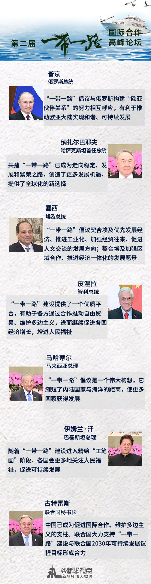 今天,來自世界各地的朋友再次聚首。習(xí)主席同各方來賓一起,登高望遠(yuǎn),攜手前行——