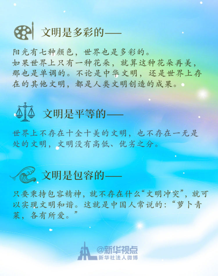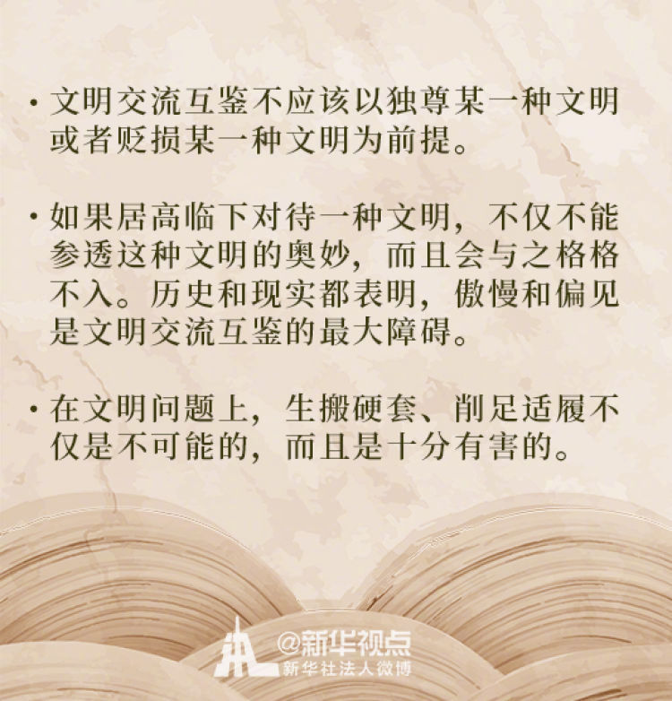 在這次演講中,習(xí)近平主席用生動(dòng)的語(yǔ)言講明了對(duì)待不同文明應(yīng)有的態(tài)度和原則: