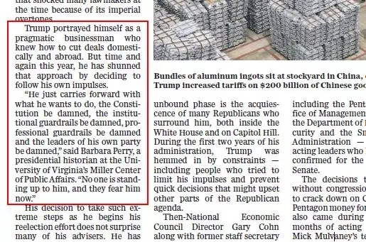 “他把自己描繪成一個(gè)務(wù)實(shí)的商人”,但是“他只是想做什么就做什么,憲法該死、制度該死、專業(yè)防護(hù)措施該死,”弗吉尼亞大學(xué)米勒公共事務(wù)中心的總統(tǒng)歷史學(xué)家芭芭拉·佩里說:“他所在黨派的領(lǐng)導(dǎo)人都很可惡,”“沒有人站起來對(duì)抗他,他們現(xiàn)在害怕他。”