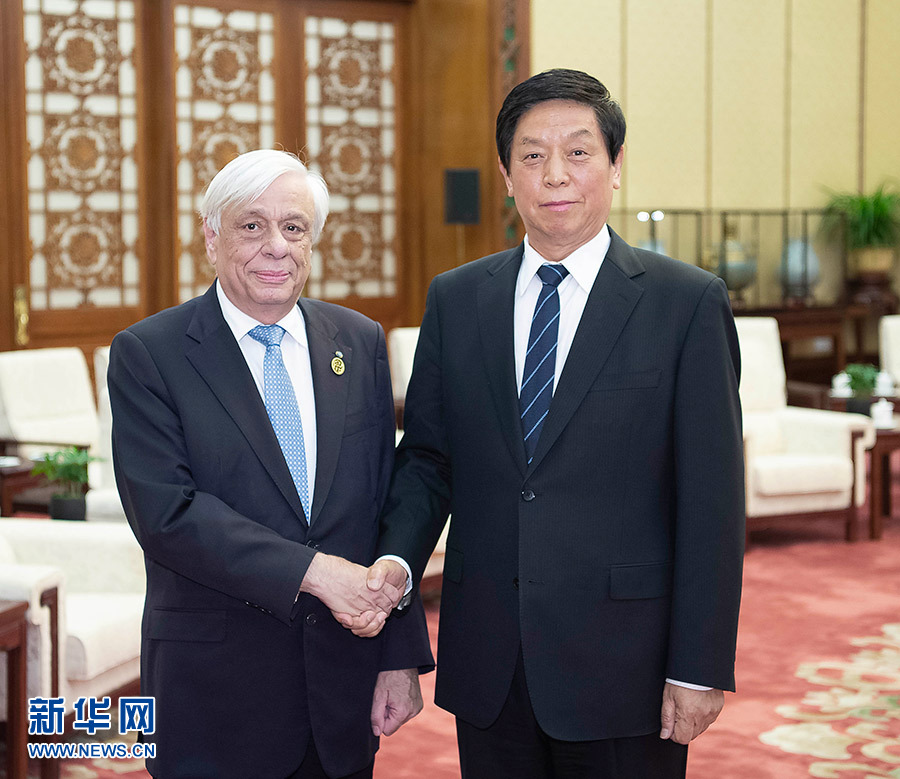 5月13日,全國(guó)人大常委會(huì)委員長(zhǎng)栗戰(zhàn)書(shū)在北京人民大會(huì)堂會(huì)見(jiàn)希臘總統(tǒng)帕夫洛普洛斯。 新華社記者 李濤 攝