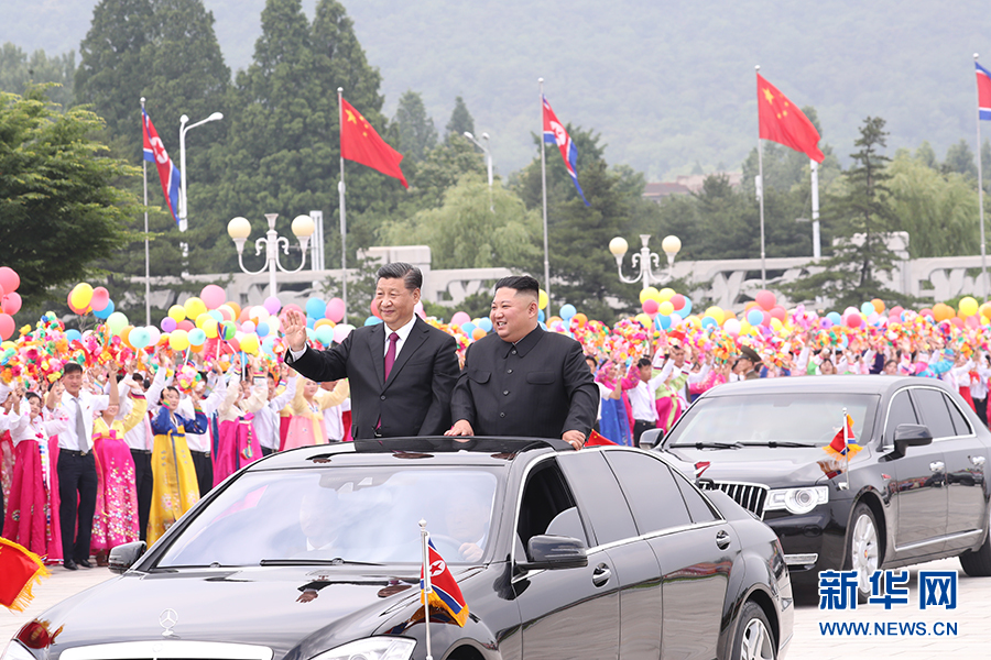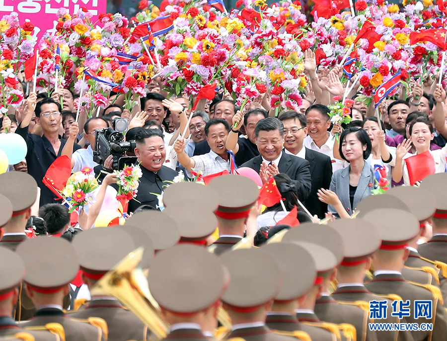 歡迎儀式結(jié)束后,在21輛禮賓摩托車(chē)的護(hù)衛(wèi)下,習(xí)近平乘車(chē)前往錦繡山迎賓館。沿途數(shù)十萬(wàn)群眾揮舞中朝兩國(guó)國(guó)旗和五彩繽紛的鮮花,熱情洋溢地高呼中朝友誼萬(wàn)歲等口號(hào),夾道歡迎。