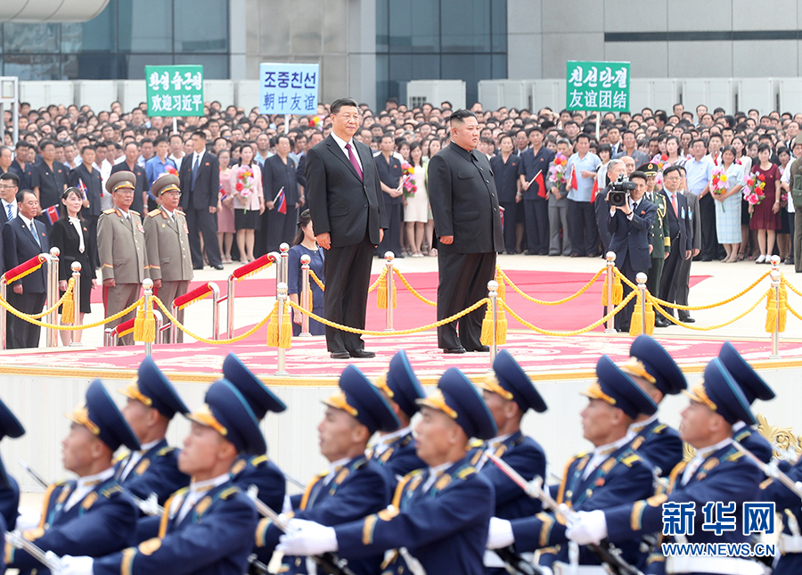 朝方在機(jī)場(chǎng)舉行隆重歡迎儀式。在21響禮炮聲中,軍樂(lè)隊(duì)奏中朝兩國(guó)國(guó)歌,習(xí)近平在金正恩陪同下檢閱了朝鮮人民軍三軍儀仗隊(duì),并觀(guān)看了分列式表演。