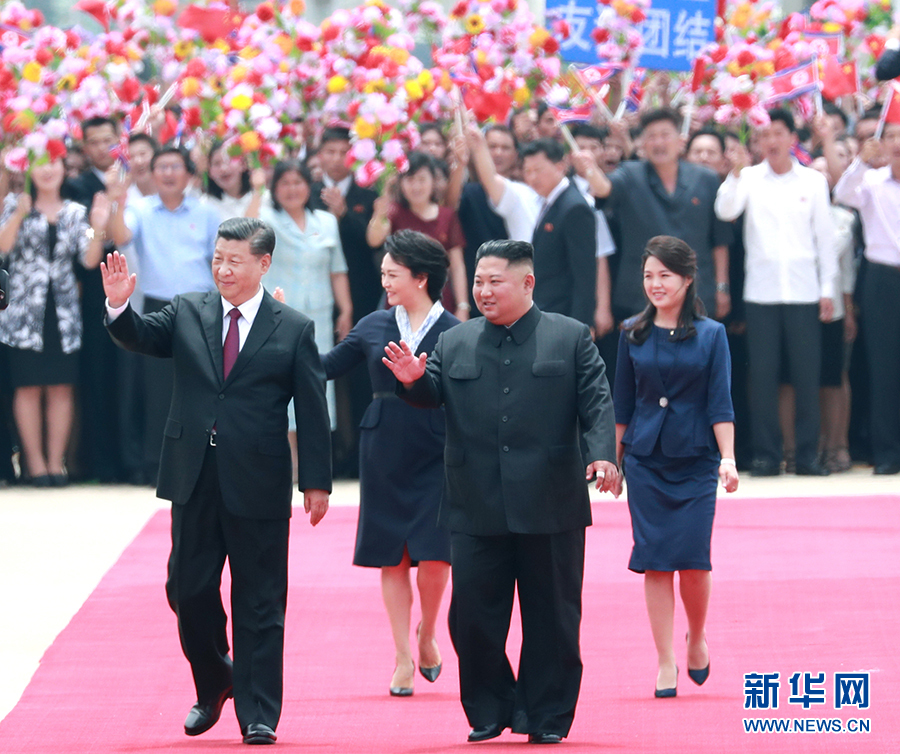 6月20日,中共中央總書(shū)記、國(guó)家主席習(xí)近平乘專(zhuān)機(jī)抵達(dá)平壤,開(kāi)始對(duì)朝鮮民主主義人民共和國(guó)進(jìn)行國(guó)事訪(fǎng)問(wèn)。朝鮮勞動(dòng)黨委員長(zhǎng)、國(guó)務(wù)委員會(huì)委員長(zhǎng)金正恩和夫人李雪主到機(jī)場(chǎng)熱情迎接習(xí)近平和夫人彭麗媛。朝方在機(jī)場(chǎng)舉行隆重歡迎儀式。 新華社記者 劉衛(wèi)兵 攝