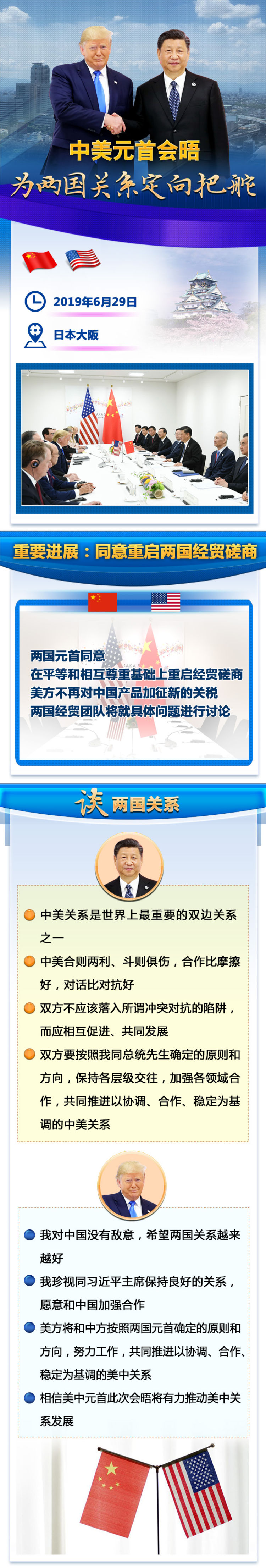 舉世矚目的中美元首會(huì)晤,于6月29日在日本大阪舉行。國家主席習(xí)近平同美國總統(tǒng)特朗普就事關(guān)中美關(guān)系發(fā)展的根本性問題、當(dāng)前中美經(jīng)貿(mào)摩擦以及共同關(guān)心的國際和地區(qū)問題深入交換意見,為下階段兩國關(guān)系發(fā)展定向把舵,同意推進(jìn)以協(xié)調(diào)、合作、穩(wěn)定為基調(diào)的中美關(guān)系。