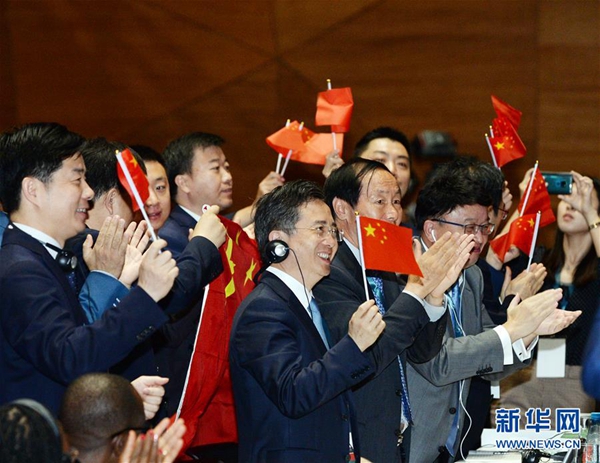 7月6日,在阿塞拜疆巴庫,中國代表團(tuán)在世界遺產(chǎn)大會上慶祝中國良渚古城遺址申遺成功。中國良渚古城遺址6日在阿塞拜疆巴庫舉行的世界遺產(chǎn)大會上獲準(zhǔn)列入世界遺產(chǎn)名錄。至此,中國世界遺產(chǎn)總數(shù)已達(dá)55處,位居世界第一。新華社發(fā)(巴巴耶夫 攝)