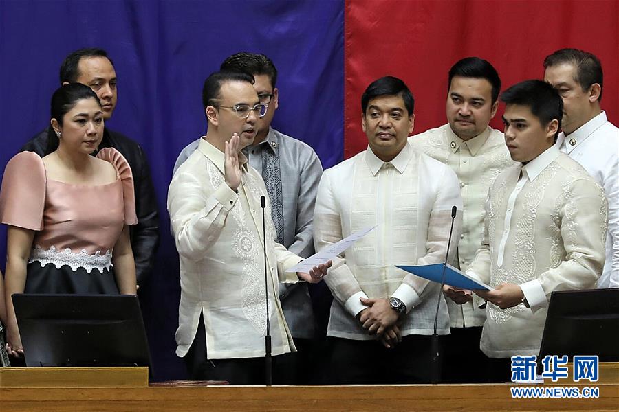 7月22日,在菲律賓大馬尼拉地區(qū)的奎松城,艾倫·彼得·卡耶塔諾(左三)宣誓就職新一任菲律賓眾議長(zhǎng)。新華社發(fā)