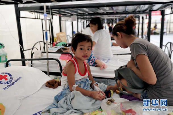 8月13日,在菲律賓甲米地省一處登革熱應(yīng)急醫(yī)療站,一名母親照顧自己患病的孩子。新華社發(fā)(魯埃勒·烏馬利 攝)