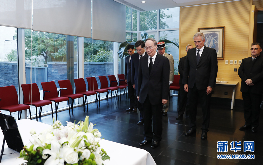 9月28日,國(guó)家副主席王岐山前往法國(guó)駐華使館,吊唁法國(guó)前總統(tǒng)雅克·希拉克逝世。 新華社記者 劉彬 攝