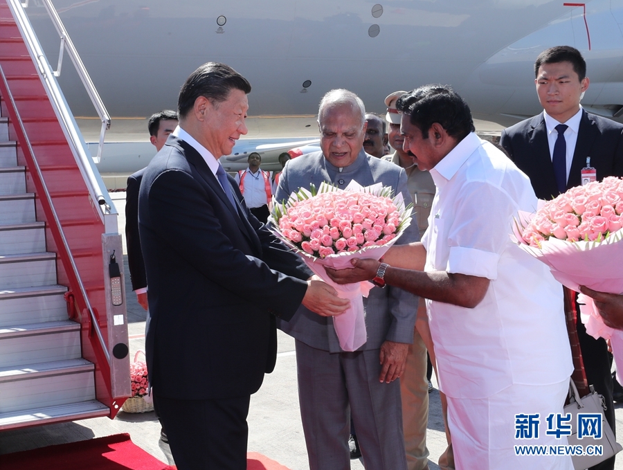 10月11日,國家主席習近平乘專機抵達金奈,應印度共和國總理莫迪邀請,出席中印領導人第二次非正式會晤。印度泰米爾納德邦邦長普羅希特、首席部長帕拉尼斯瓦米等在舷梯旁迎接,向習近平敬獻鮮花。 新華社記者 鞠鵬 攝