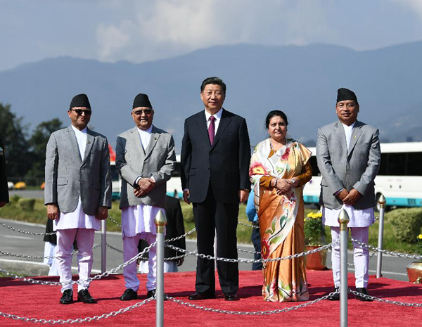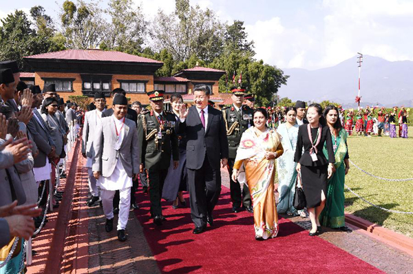 10月12日,國(guó)家主席習(xí)近平乘專機(jī)抵達(dá)加德滿都,開始對(duì)尼泊爾進(jìn)行國(guó)事訪問。尼泊爾總統(tǒng)班達(dá)里在機(jī)場(chǎng)為習(xí)近平舉行具有濃郁尼泊爾民族特色的歡迎儀式。新華社記者高潔攝