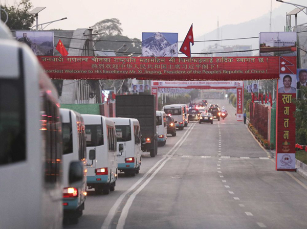 10月12日,尼泊爾首都加德滿都,車隊(duì)經(jīng)過一道道迎賓拱門。新華社記者丁林?jǐn)z