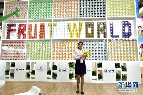 11月5日,第二屆進(jìn)博會(huì)展區(qū)的工作人員展示香蕉等各色水果。 第二屆中國(guó)國(guó)際進(jìn)口博覽會(huì)正在上海國(guó)家會(huì)展中心舉行,各展區(qū)色彩豐富的展品與設(shè)計(jì)讓人應(yīng)接不暇。 新華社記者才揚(yáng) 攝