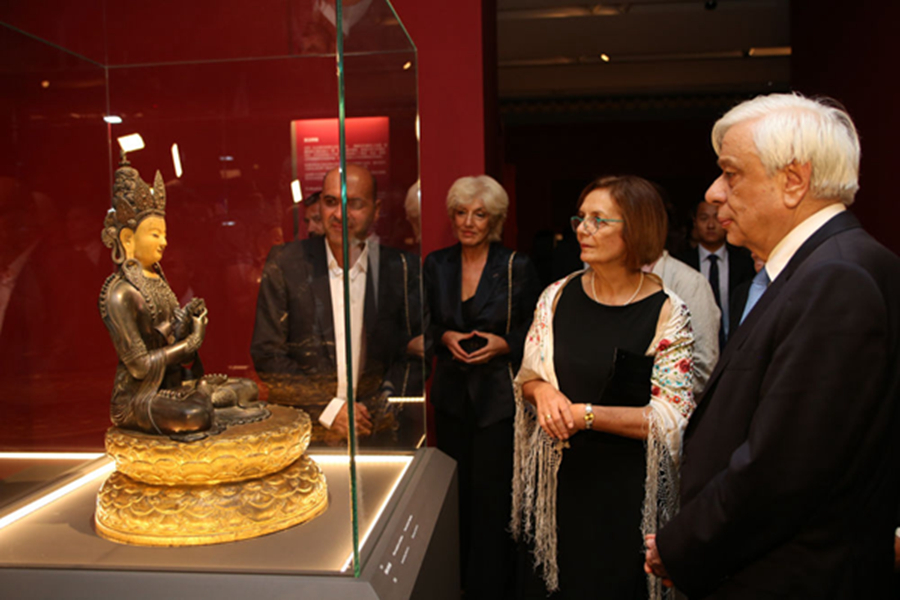 2018年9月14日,在希臘首都雅典衛(wèi)城博物館,希臘總統(tǒng)帕夫洛普洛斯(右)在“重文德之光華:重華宮原狀文物展”上參觀。這是來(lái)自中國(guó)故宮博物院的154件清朝乾隆時(shí)期珍貴文物首次出國(guó)展出。新華社發(fā)(馬里奧斯·羅洛斯攝)