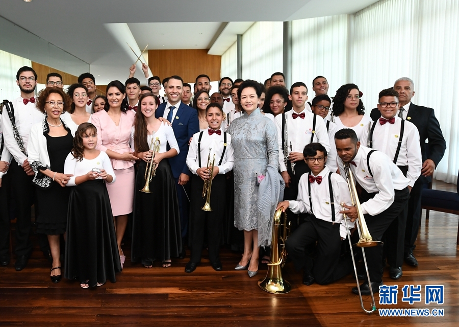 當(dāng)?shù)貢r(shí)間11月13日中午,應(yīng)巴西總統(tǒng)夫人米歇爾邀請(qǐng),國(guó)家主席習(xí)近平夫人彭麗媛出席金磚國(guó)家領(lǐng)導(dǎo)人配偶活動(dòng)。這是彭麗媛同巴西青少年管樂(lè)團(tuán)演員們親切交流。 新華社記者 謝環(huán)馳 攝