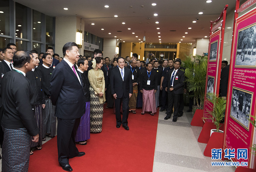 儀式開始前,習近平在緬方領(lǐng)導(dǎo)人陪同下,觀看了慶祝中緬建交70周年圖片展。圖片展記錄了中緬建交70年來雙方交往中的一幕幕感人畫面。習近平不時駐足,認真聽取講解并仔細觀看。