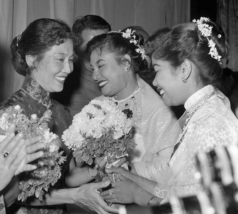 ▲1961年1月6日,中國電影周在仰光總統(tǒng)電影院舉行開幕式。圖為緬甸電影演員向中國電影演員張瑞芳(左)獻(xiàn)花。