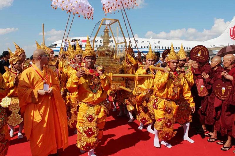 ▲2011年11月6日,北京西山靈光寺佛牙舍利塔中供奉的佛牙舍利抵達(dá)內(nèi)比都機(jī)場,開始為期48天的緬甸供奉巡禮。