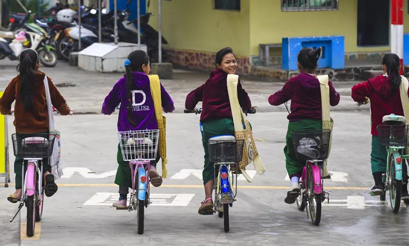 ▲國境線將云南省瑞麗市姐相鄉(xiāng)一個(gè)村寨一分為二,中方一側(cè)稱銀井,緬方一側(cè)稱芒秀,是典型的“一寨兩國”村落。圖為銀井小學(xué)幾位緬籍學(xué)生騎車回家,跨過銀井邊防口岸國境線。