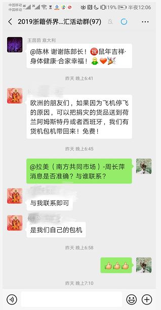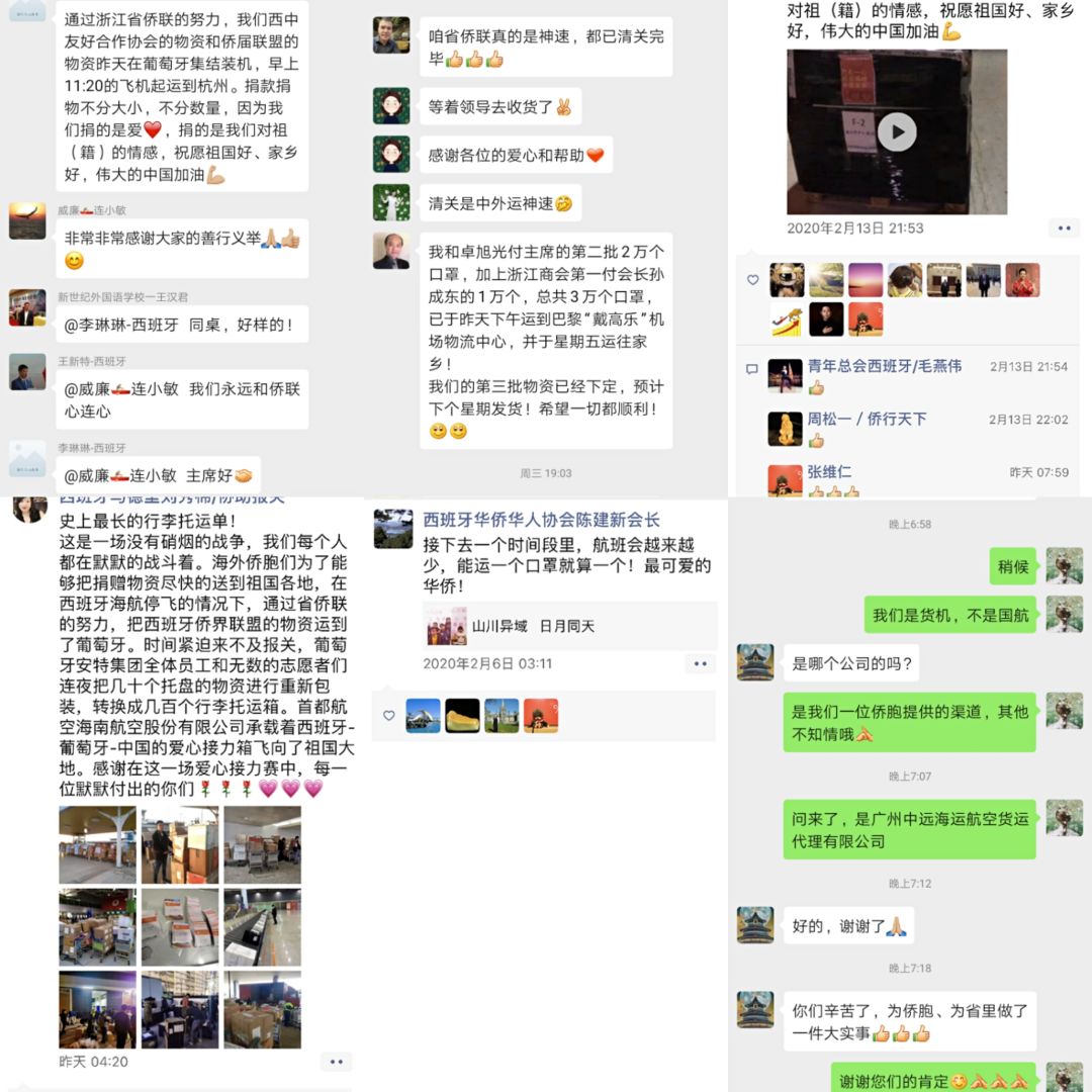 2月1日晚,浙江省僑界名媛匯微信群里的一則信息引起了大家的注意?!皻W洲的朋友們,如果因為飛機(jī)停飛的原因,可以把捐災(zāi)的貨品送到荷蘭阿姆斯特丹或者西班牙,我們有貨機(jī)包機(jī)帶回來!免費!”群里瞬間沸騰,求助信息紛至沓來。省僑聯(lián)黨組書記、主席連小敏捕捉到這一信息,隨即高度重視,求證確認(rèn)后,第一時間研究討論,展開部署。