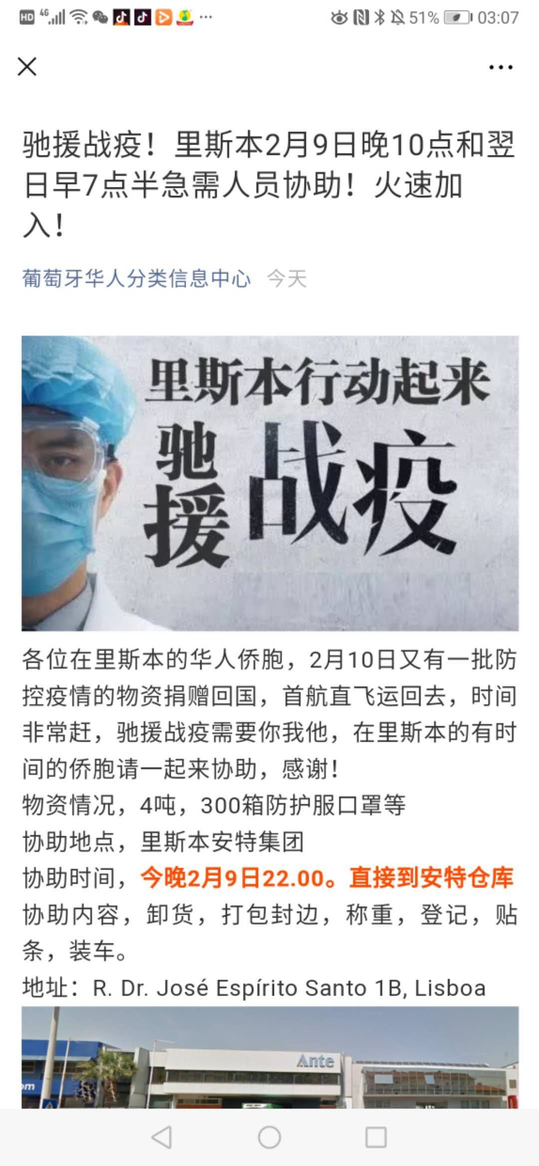 葡萄牙里斯本僑胞劉建云在獲悉省僑聯(lián)西班牙第二批物資因航班臨時取消必須分流至葡萄牙里斯本卻面臨物流運送困難的信息時,二話不說,立刻在微信群里吹響集結(jié)的號角:“由西班牙華人僑胞募捐籌集的20噸防護(hù)服、護(hù)目鏡和口罩等醫(yī)療物資,緊急轉(zhuǎn)運葡萄牙交付首都航空中葡直航航班托運回國,當(dāng)晚22:30分急需人手卸貨、打包、裝車。有空的僑胞請接龍報名!”群里一呼百應(yīng),瞬時超員。當(dāng)晚就將西班牙運送過來的捐贈物資進(jìn)行重新打包直至深夜。