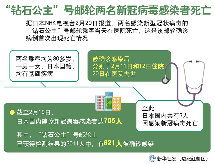 NHK電視臺報道稱,兩名乘客均為80多歲,一男一女,日本國籍,均有基礎疾病,被確診感染后分別于2月11日和12日住院,20日在醫(yī)院去世。至此,日本國內(nèi)共有3人因感染新冠病毒死亡。