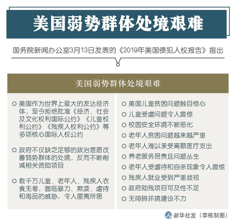 新華社北京3月13日電(記者王鵬、賈釗)國務院新聞辦13日發(fā)表的《2019年美國侵犯人權報告》指出,美國弱勢群體處境艱難。