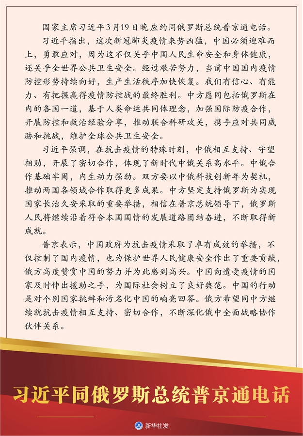 習(xí)近平指出,這次新冠肺炎疫情來勢兇猛,中國必須迎難而上,勇敢應(yīng)對,因為這不僅關(guān)乎中國人民生命安全和身體健康,還關(guān)乎全世界公共衛(wèi)生安全。經(jīng)過艱苦努力,當(dāng)前中國國內(nèi)疫情防控形勢持續(xù)向好,生產(chǎn)生活秩序加快恢復(fù)。我們有信心、有能力、有把握贏得疫情防控戰(zhàn)的最終勝利。中方愿同包括俄羅斯在內(nèi)的各國一道,基于人類命運共同體理念,加強國際防疫合作,開展防控和救治經(jīng)驗分享,推動聯(lián)合科研攻關(guān),攜手應(yīng)對共同威脅和挑戰(zhàn),維護(hù)全球公共衛(wèi)生安全。