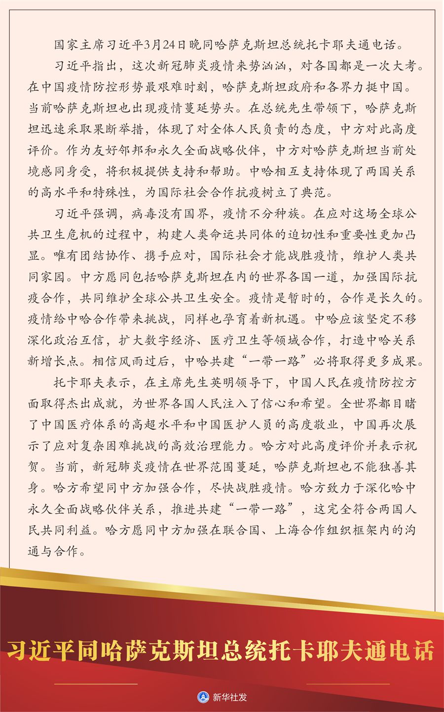 新華社北京3月24日電? 國家主席習近平24日晚同哈薩克斯坦總統(tǒng)托卡耶夫通電話。