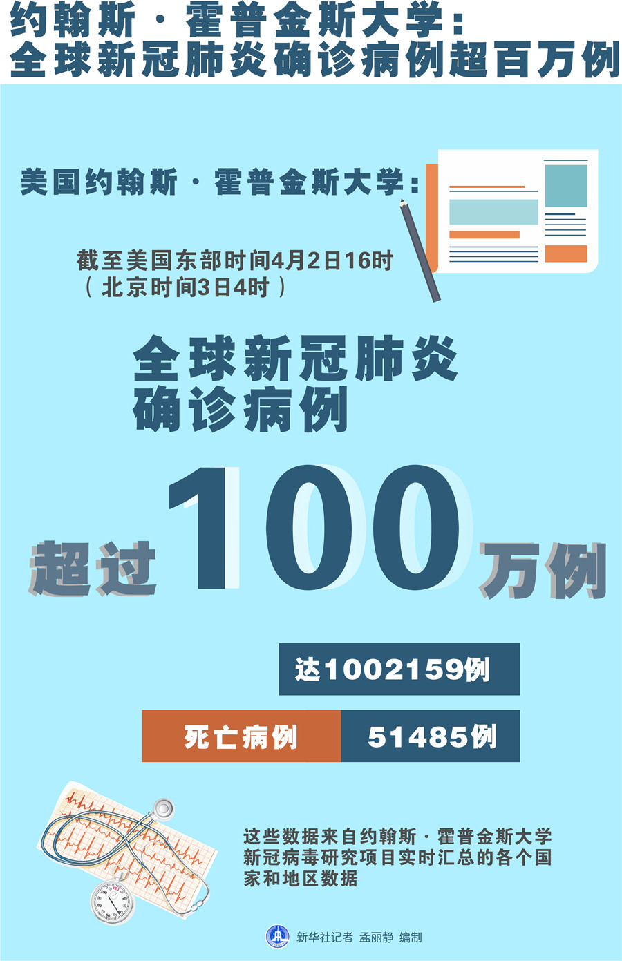 美國(guó)約翰斯·霍普金斯大學(xué):截至美國(guó)東部時(shí)間2日16時(shí)(北京時(shí)間3日4時(shí)),全球確診病例達(dá)1002159例,死亡病例為51485例。美國(guó)確診病例增至236339例,是目前確診病例最多的國(guó)家,其死亡病例為5648例。