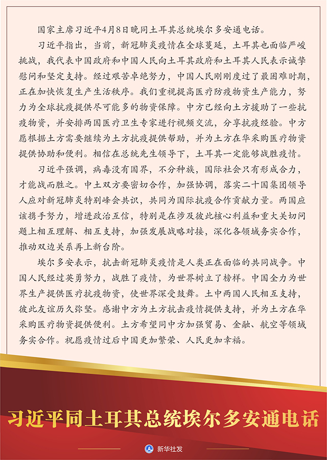 習(xí)近平指出,當(dāng)前,新冠肺炎疫情在全球蔓延,土耳其也面臨嚴(yán)峻挑戰(zhàn),我代表中國政府和中國人民向土耳其政府和土耳其人民表示誠摯慰問和堅定支持。經(jīng)過艱苦卓絕努力,中國人民剛剛度過了最困難時期,正在加快恢復(fù)生產(chǎn)生活秩序。我們重視提高醫(yī)療防疫物資生產(chǎn)能力,努力為全球抗疫提供盡可能多的物資保障。中方已經(jīng)向土方援助了一些抗疫物資,并安排兩國醫(yī)療衛(wèi)生專家進行視頻交流,分享抗疫經(jīng)驗。中方愿根據(jù)土方需要繼續(xù)為土方抗疫提供幫助,并為土方在華采購醫(yī)療物資提供協(xié)助和便利。相信在總統(tǒng)先生領(lǐng)導(dǎo)下,土耳其一定能夠戰(zhàn)勝疫情。