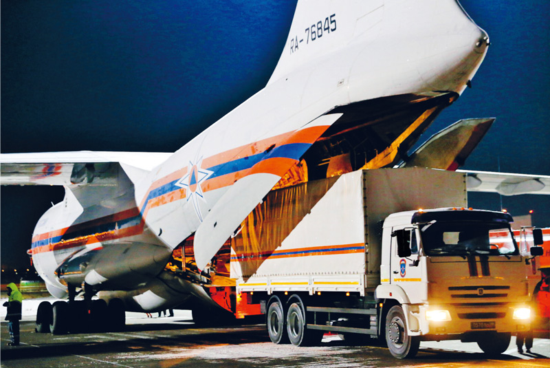 2020年2月8日,在俄羅斯莫斯科附近的茹科夫斯基機(jī)場,工作人員將俄羅斯政府向中方提供的醫(yī)療援助物資裝上運(yùn)輸機(jī)。 新華社/衛(wèi)星社