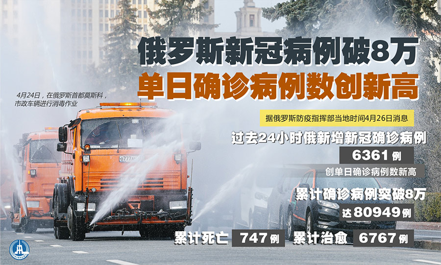 新華社莫斯科4月26日電(記者魯金博)據(jù)俄羅斯防疫指揮部26日消息,過(guò)去24小時(shí)俄新增新冠確診病例6361例,創(chuàng)單日確診病例數(shù)新高,累計(jì)確診病例突破8萬(wàn),達(dá)80949例。