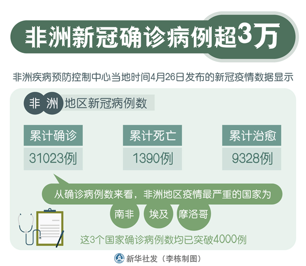 新華社達(dá)累斯薩拉姆4月26日電 綜合新華社駐非洲地區(qū)記者報(bào)道:非洲疾病預(yù)防控制中心26日發(fā)布的新冠疫情數(shù)據(jù)顯示,非洲地區(qū)新冠累計(jì)確診病例數(shù)為31023例,累計(jì)死亡1390例,累計(jì)治愈9328例。為支持非洲各國抗擊新冠疫情,聯(lián)合國推出信息平臺協(xié)助抗疫。
