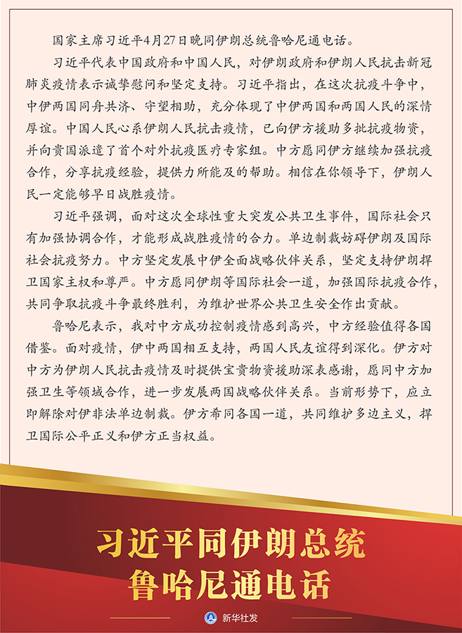 習(xí)近平強(qiáng)調(diào),面對(duì)這次全球性重大突發(fā)公共衛(wèi)生事件,國(guó)際社會(huì)只有加強(qiáng)協(xié)調(diào)合作,才能形成戰(zhàn)勝疫情的合力。單邊制裁妨礙伊朗及國(guó)際社會(huì)抗疫努力。中方堅(jiān)定發(fā)展中伊全面戰(zhàn)略伙伴關(guān)系,堅(jiān)定支持伊朗捍衛(wèi)國(guó)家主權(quán)和尊嚴(yán)。中方愿同伊朗等國(guó)際社會(huì)一道,加強(qiáng)國(guó)際抗疫合作,共同爭(zhēng)取抗疫斗爭(zhēng)最終勝利,為維護(hù)世界公共衛(wèi)生安全作出貢獻(xiàn)。