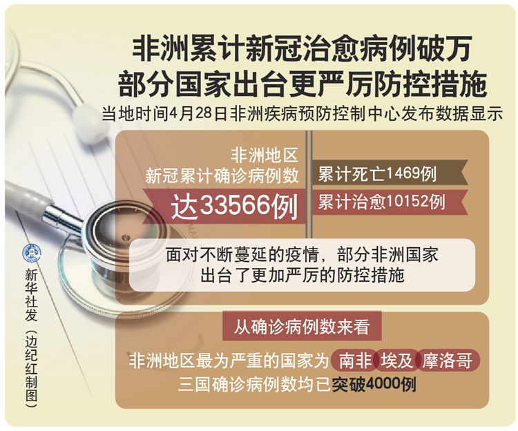 新華社洛美4月28日電 綜合新華社駐非洲地區(qū)記者報道:非洲疾病預(yù)防控制中心28日發(fā)布數(shù)據(jù)顯示,非洲地區(qū)新冠累計確診病例數(shù)達33566例,累計死亡1469例,累計治愈10152例。面對不斷蔓延的疫情,部分非洲國家出臺了更加嚴厲的防控措施。