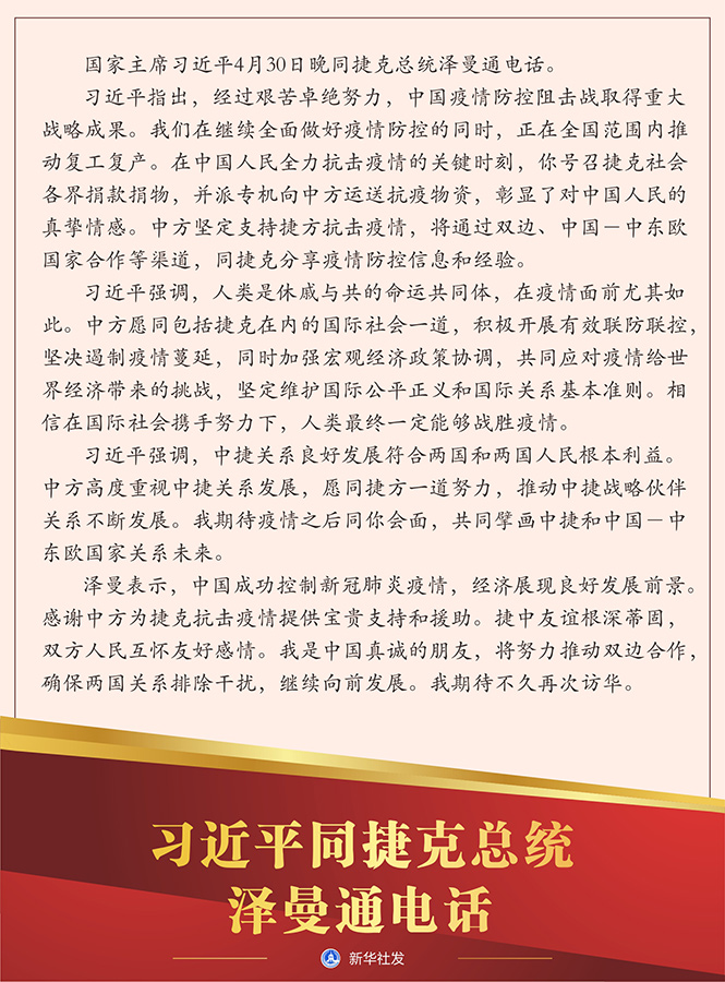 新華社北京4月30日電 國(guó)家主席習(xí)近平4月30日晚同捷克總統(tǒng)澤曼通電話。