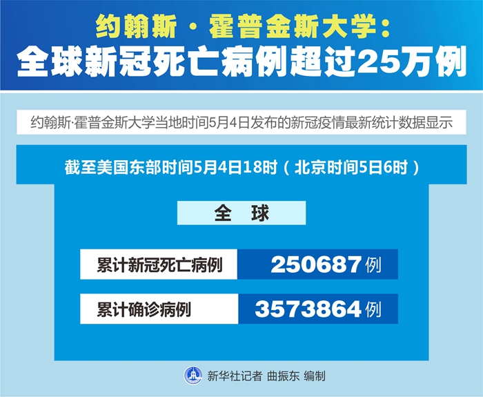 新華社紐約5月4日電? 美國約翰斯·霍普金斯大學(xué)4日發(fā)布的新冠疫情最新統(tǒng)計數(shù)據(jù)顯示,全球累計新冠死亡病例超過25萬例。
